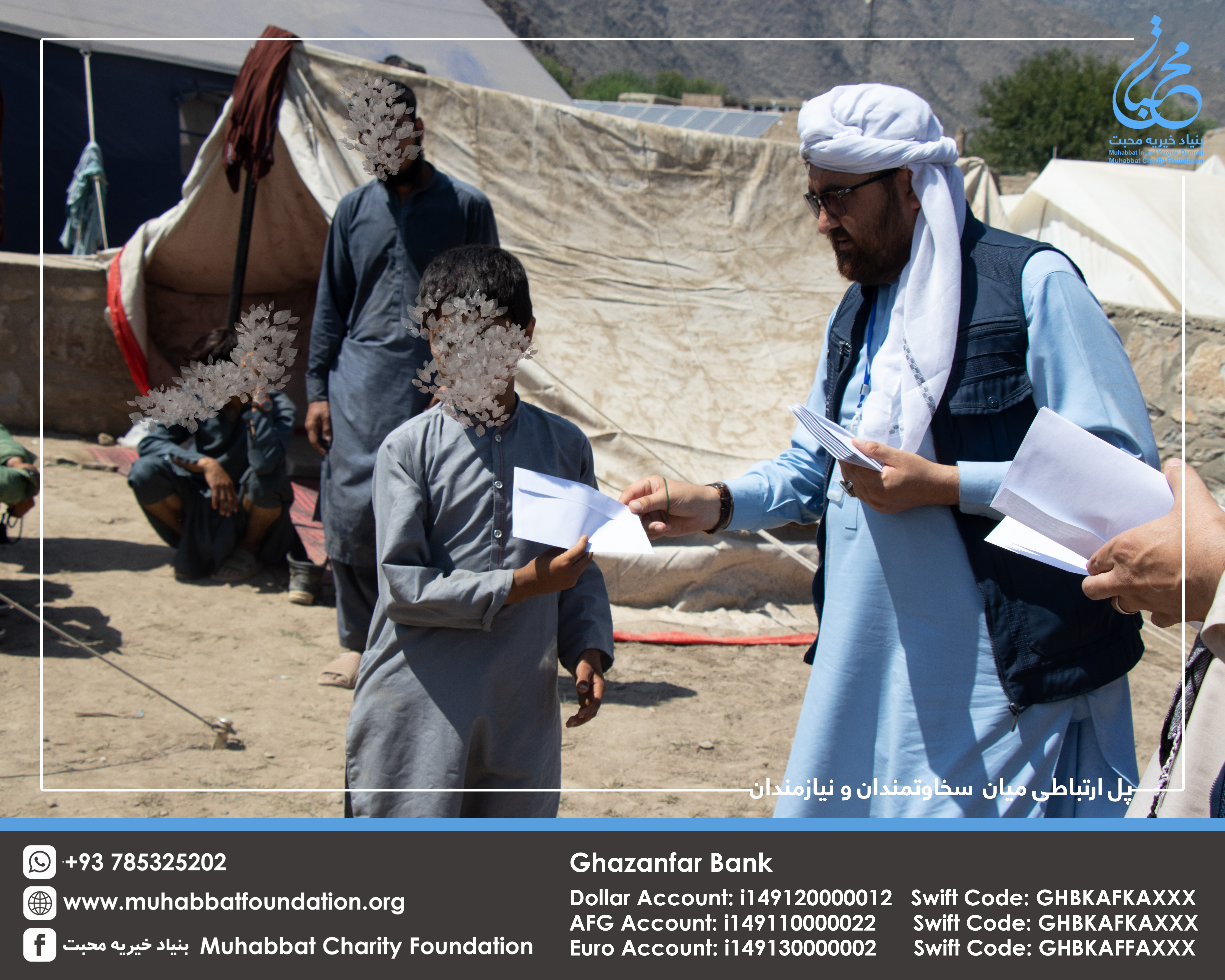 از آدرس بنیاد خیریه محبت به ولسوالی حوکی‌ (سوکی) ولایت کنر رفته برای یکتعداد خانواده های زلزله زده که در نتیجه زلزله هر کدام شان چند عضو خانواده خود را از دست داده اند، کمک نقدی نموده مسوولیت دینی ، ایمانی و اجتماعی خود را ادا نمودیم.